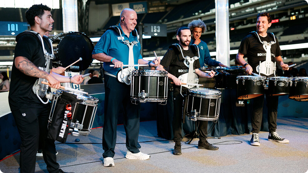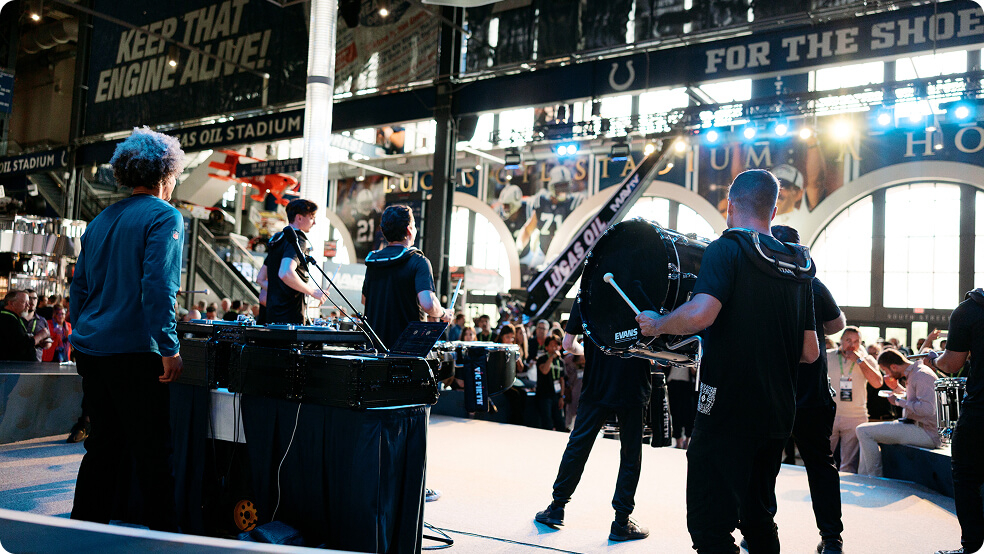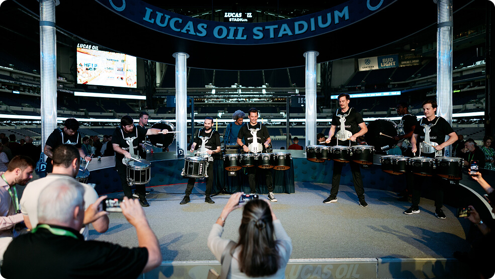 When the final keynote wrapped and guests stepped out of the convention center, they weren’t simply walking to their next destination. They were stepping into a curated experience designed to shift the tone, elevate the mood, and signal the start of something entirely new. Positioned at the entrance the BDE drumline delivers custom cadence and branded performance to welcome guests and set the tone for an elevated corporate experience. BDE’s drumline provided the bridge. Positioned in the underground tunnels linking the convention center to Lucas Oil Stadium, the ensemble became the heartbeat of a unique transition. They played signature cadences that lifted the energy and reoriented the crowd from conference focus to celebration mode. With every beat, the space came alive, guiding thousands of guests toward an immersive evening event already pulsing with anticipation.